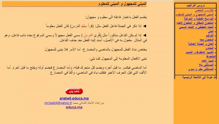 في إطار نشر سلسلة من الموارد الرقمية والسمعية البصرية والحقائب البيداغوجية في النافذة التي تم إنشاؤها بالموقع الإلكتروني "جديد انفو" بإسم "التعليم عن بعد"، اليكم رابط يتضمن دروس وتمارين تفاعلية لمادة اللغة العربية للسنة السادسة من التعليم الابتدائي:(اضغط على الرابط )