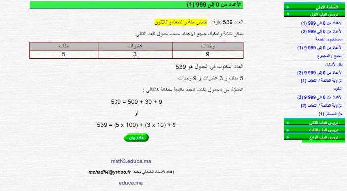في إطار نشر سلسلة من الموارد الرقمية والسمعية البصرية والحقائب البيداغوجية في النافذة التي تم إنشاؤها بالموقع الإلكتروني "جديد انفو" بإسم "التعليم عن بعد"، اليكم رابط يتضمن دروس وتمارين تفاعلية لمادة الرياضيات للسنة الثالثة من التعليم الابتدائي:(اضغط على الرابط )