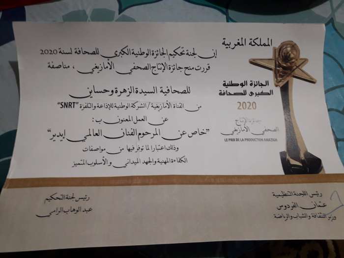 بحضور وزير الثقافة والشباب والرياضة، عثمان الفردوس، وشخصيات من عالم الصحافة والفن والأدب والسياسة، تم اليوم الأربعاء 30 دجنبر الجاري بمدينة الرباط تتويج الصحفية أبنة قصر هارون بضواحي الريصاني بالجائزة الوطنية الكبرى للصحافة في دورتها الثامنة عشر صنف الإنتاج الصحفي الأمازيغي.