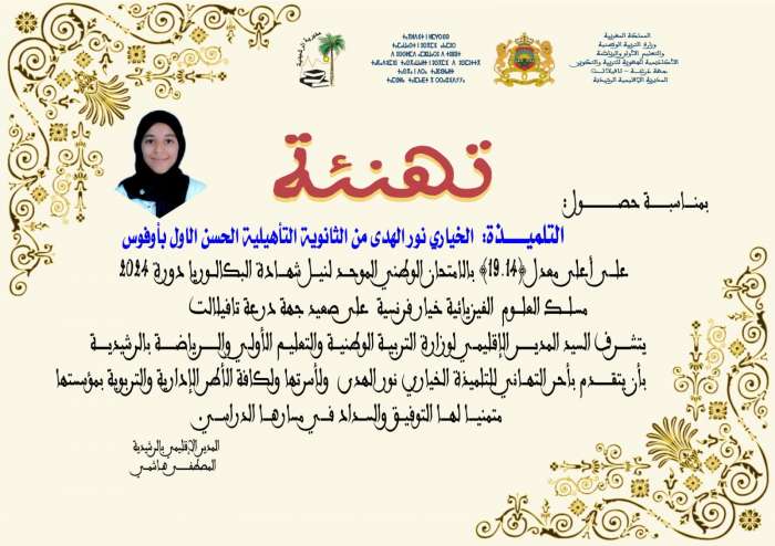 وأوضح ذات البلاغ والذي توصلت "جديد انفو" بنسخة منه أن هذا المعدل حصلت عليه التلميذة نور الهدى الخياري، عن مسلك العلوم الفيزيائية خيار فرنسية من الثانوية التأهيلية الحسن الأول أوفوس بالرشيدية.