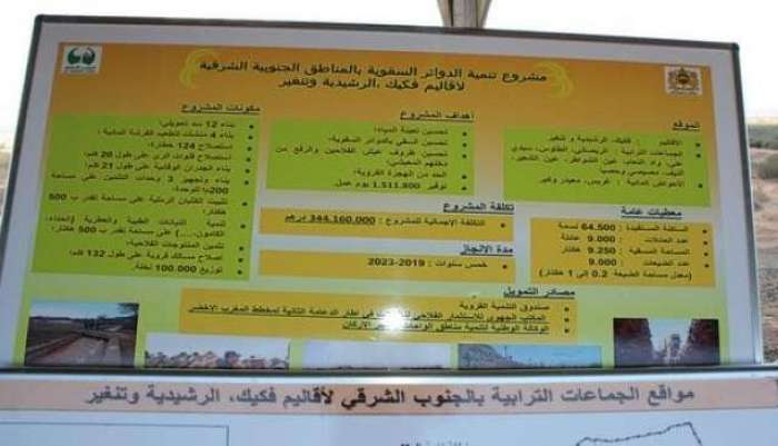 المشروع بتكلفة اجمالية 40.000.000 درهم وسيوفر 177.8000 يوم عمل ومدة الإنجاز اربع سنوات تبتدئ من 2019 وتنهي سنة 2022 بتمويل من المكتب الجهوي للاستثمار الفلاحي ومديرية الري وإعداد المجال الفلاحي والوكالة الوطنية لتنمية مناطق الواحات وشجر الأركان ، اما مكونات المشروع فهي استصلاح سد التحويل مقطع الصفا وبناء شبكة الري لمياه الفيض على طول 10.5 كلم واستصلاح مسلك على طول شبكة الري وتثبيت الكثبان الرملية على مساحة تقدر ب 15 هكتارا .