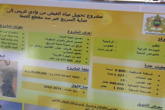 المشروع التحويلي من واد غريس الى ضاية السريج بمرزوگة عبر سد مقطع الصفا والذي أعطى انطلاقته رئيس الحكومة عزيز أخنوش حين كان وزيرا للفلاحة والصيد البحري والتنمية القروية والمياه والغابات على عهد محمد بنرباك الوالي الأسبق لجهة درعة تافيلالت بتاريخ الاربعاء 24 اكتوبر 2018 بجماعة الطاوس والذي بدأت فيه الاشغال وتوقفت حاليا حسب المعلومات المتوفرة للجريدة وحسب شهود عيان يمرون بشكل يومي بجوار الأشغال المتوقفةوالتي لم تكتمل لأسباب ما. وحسب التوضيحات التي قدمت للوزير انذاك بحضور مدير المكتب الجهوي للاستثمار الفلاحي بوسفول وبحضور احماد بورشوق رحمة الله عليه الرئيس السابق لجماعة الطاوس، وبحضور ممثلين عن الساكنة أن هذا المعبر المائي ستنطلق أشغاله سنة 2019 وتنتهي سنة 2022 وقد مرت الآن تقريبا سنتان او ثلاث والمشروع لم يكتمل بعد مما عطل وحرم الساكنة من هذه المياه التي تمر وتراقب بالعين حسرة على الإنجاز ولم ترفع درجة السرعة القصوى في التنزيل ،بناء على خطاب صاحب الجلالة الملك محمد السادس نصره الله الذي أولى السياسة المائية أهمية كبرى في خطابه الأخير نظرا للتحولات والتغيرات المناخية وأثرها على الأمن الغذائي والاستقرار بالمناطق النائية.