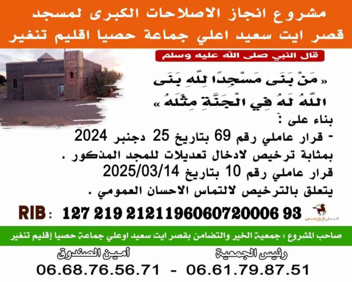 يلتمس مكتب جمعية بناء مسجد قصر ايت سعيد اعلي بجماعة حصيا اقليم تنغير من اهل البر والاحسان الى مد يد المساعدة سواء المادية أو العينية، قصد المساهمة في إتمام بناء المسجد الذي يتم بناؤه بالقصر عسى الله ان يكتبها صدقة جارية لكل من يبادر بمد يد المساعدة والله لا يضيع أجر من عمل عملا صالحا.