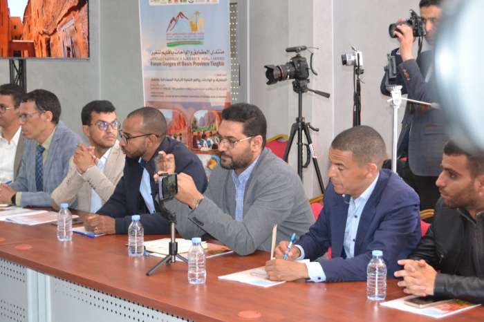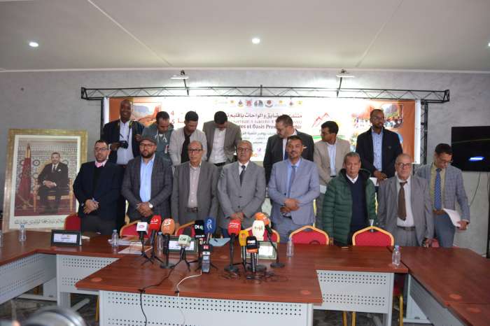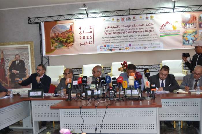 تحت شعار: 'المضايق والواحات : روافع للتنمية الترابية المستدامة بالإقليم' احتضن فندق صاغرو بمدينة تنغير، صباح اليوم السبت 20 أبريل الجاري ندوة صحفية لتقديم برنامج منتدى المضايق والواحات، المزمع تنظيمه من 2 إلى 4 ماي المقبل من تنظيم المجلس الإقليمي للسياحة بتنغير بدعم وإشراف من عمالة تنغير، وبشراكة مع المجلس الاقليمي والجماعات الترابية : تنغير ، بومالن دادس ، تودغى العليا ، أيت سدرات الجبل العليا ، وايت سدرات الجبل السفلى وبدعم ايضا من الوكالة الوطنية لتنمية مناطق الواحات وشجر الاركان وشركة معادن اميضر وبتعاون مع مؤسسات عمومية ومهنية وفاعلين من القطاع الخاص.
