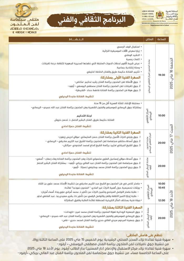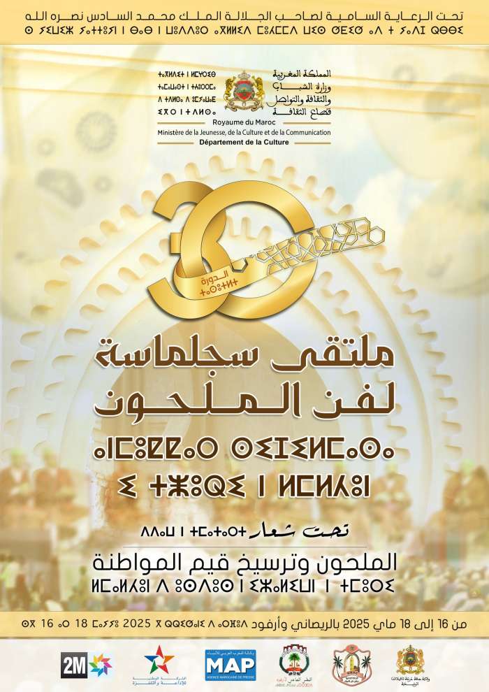 تحت الرعاية السامية لصاحب الجلالة الملك محمد السادس نصره الله، وفي إطار أجندة المهرجانات التراثية التي تسهر عليها وزارة الشباب والثقافة والتواصل -قطاع الثقافة-، تنظم وزارة الشباب والثقافة والتواصل -قطاع الثقافة- بشراكة مع ولاية جهة درعة تافيلالت وبدعم من جماعة مولاي علي الشريف وجماعة أرفود، الدورة 30 لملتـقـى سـجـلماسـة لـفـن الـمـلحـون من 16 إلى 18 ماي 2025 بكل من الريصاني وأرفود تحت شعار: " الملحون وترسيخ قيم المواطنة".