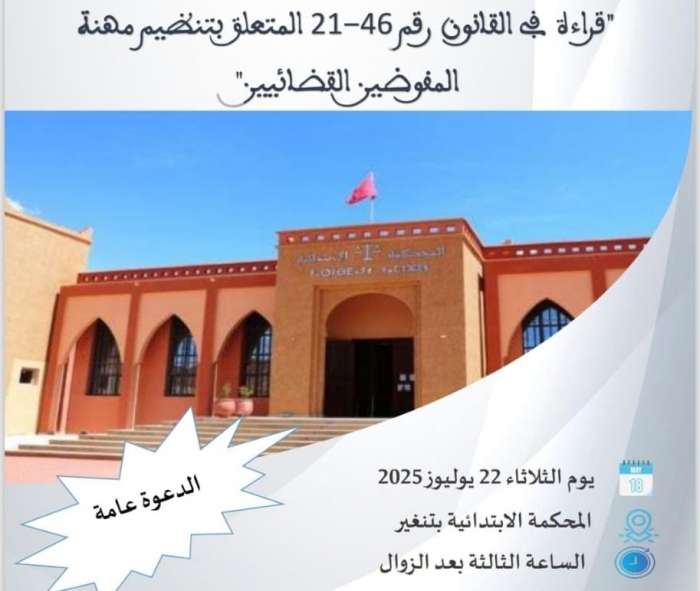 تعلن المحكمة الإبتدائية بتنغير بشراكة مع المجلس الجهوي للمفوضين القضائيين مراكش وورزازات عن تنظيم مائدة مستديرة حول موضوع "قراءة في القانون رقم 46-21 المتعلق بتنظيم مهنة المفوضين القضائيين".