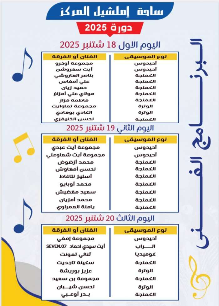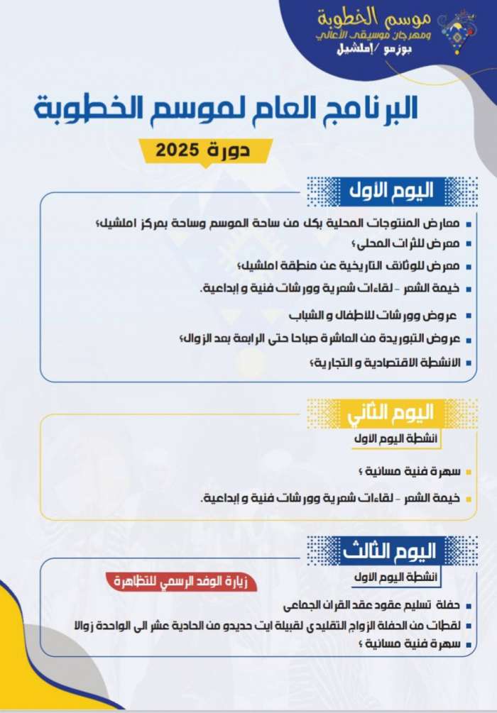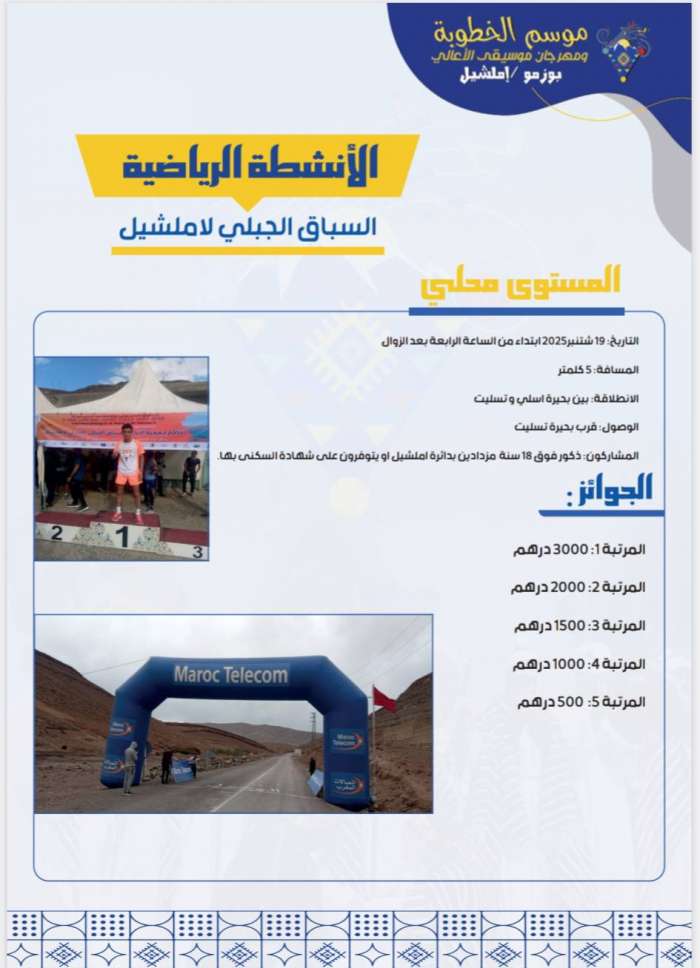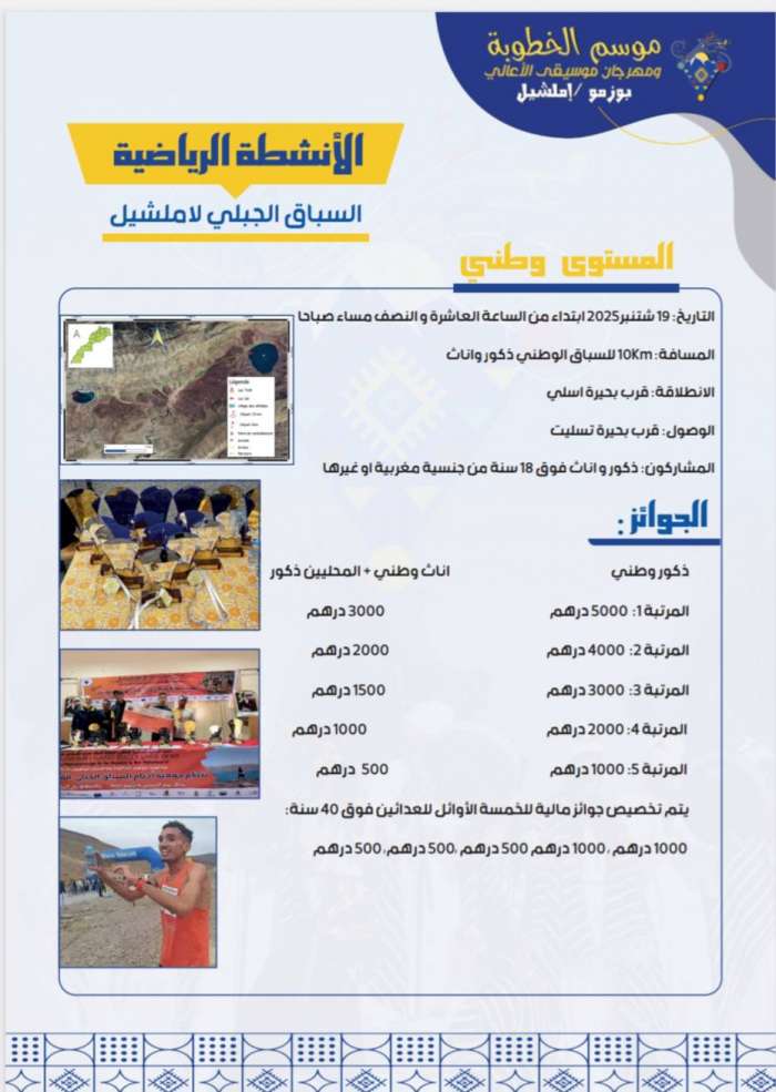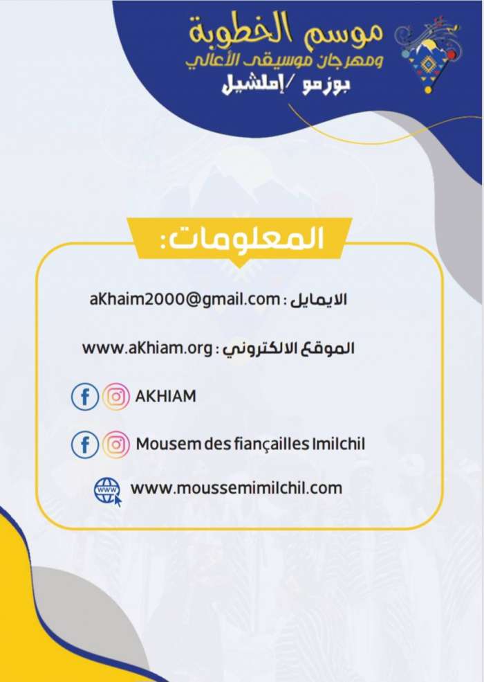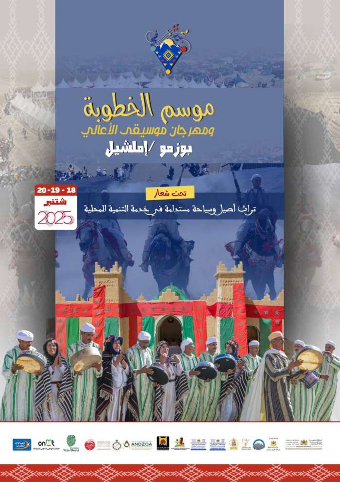 تنظم جمعية “أخيام” بشراكة مع الجماعتين الترابيتين “بوزمو” و”إملشيل” موسم الخطوبة ومهرجان موسيقى الأعالي – دورة 2025، وذلك خلال الفترة الممتدة من 18 إلى 20 شتنبر الجاري، تحت شعار: “تراث أصيل وسياحة مستدامة في خدمة التنمية المحلية”.