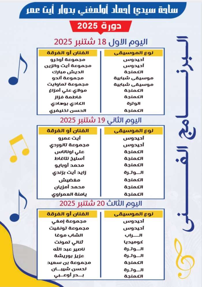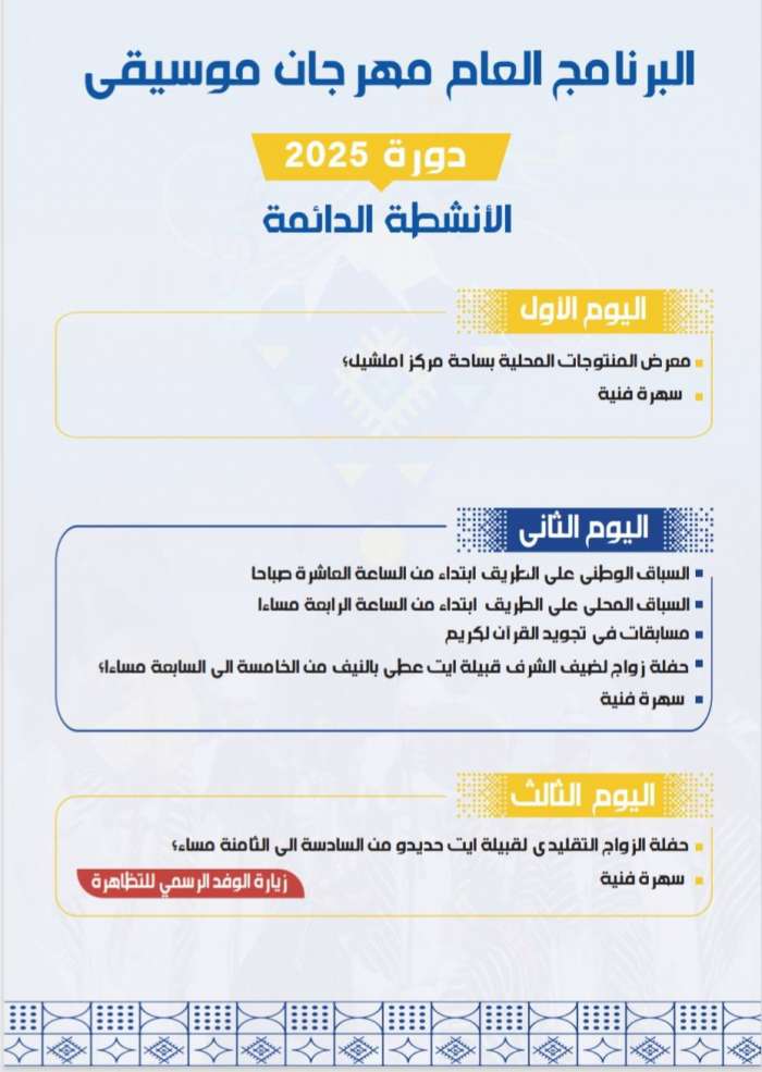 ويتضمن برنامج الموسم والمهرجان وفق البلاغ ذاته، سهرات فنية تنشطها فرق فولكلورية من مختلف ربوع المملكة، ومعرضا للمنتوجات المجالية والصناعة التقليدية بهدف خلق ﻧﺸﺎﻃ ﺗﺠﺎري مهم بالمنطقة، إضافة إلى ندوات علمية، ومسابقات رياضية، وأنشطة تربوية وترفيهية موجهة للأطفال والشباب.
