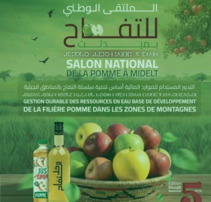 تحت الرعاية السامية لصاحب الجلالة الملك محمد السادس نصره الله، وبإشراف من وزارة الفلاحة والصيد البحري والتنمية القروية والمياه والغابات، تحتضن مدينة ميدلت فعاليات النسخة الخامسة من الملتقى الوطني للتفاح، وذلك خلال الفترة الممتدة من 15 إلى 19 أكتوبر 2025، تحت شعار: "التدبير المستدام للموارد المائية أساس تنمية سلسلة التفاح في المناطق الجبلية".