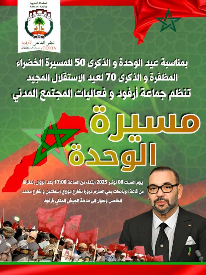بمناسبة عيد الوحدة و ذكرى المسيرة الخضراء و عيد الاستقلال نظمت جماعة وساكنة أرفود و فعاليات المجتمع المدني اليوم السبت 8نونبر الجاري مسيرة حاشدة حجت لها كل القوى من اجل ثلاث مناسبات وطنية خالدة كانت وما زالت ولا تزال تمثل نبض المغاربة جميعا بقيم وطنية عالية تحت السيادة العلوية الشريفة.