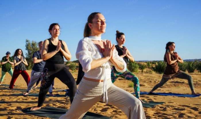تشير الساعة إلى الخامسة مساء، يتردد صدى قرع آلة “الغونغ” (آلة إيقاعية آسيوية قديمة) عبر أرجاء مخيم سياحي بمرزوكة، معلنا انطلاق حصة لليوغا عند سفح الكثبان الرملية التي تضفي سحرا خاصا على هذه الجنة الطبيعية.