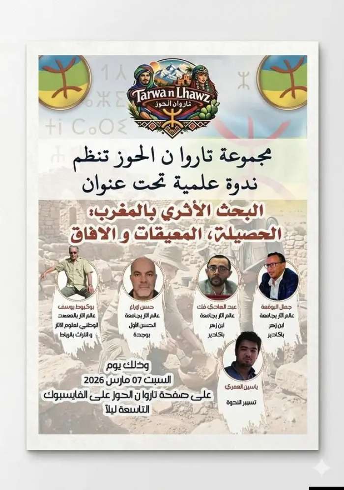 في إطار انخراطها الواعي في النقاش العمومي حول قضايا الهوية والممعرفة والتنمية، تنظم تنسيقية ،'تاروا ن الحوز' ندوة علمية، يوم السبت 07 مارس 2026 ابتداءً من الساعة التاسعة والنصف ليلاً، على صفحتها بالفيس بوك سعياً منها في ترسيخ ثقافة علمية نقدية تجعل من البحث الأكاديمي رافعة أساسية لبناء السياسات العمومية وصياغة الاختيارات الاستراتيجية.