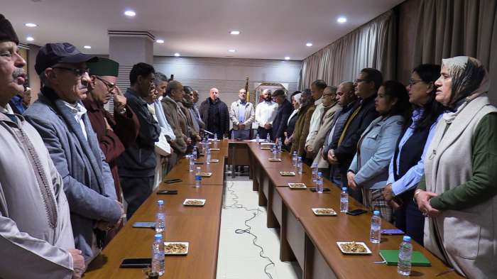 وأضاف تاشفين أنه بفضل حكمة وتبصر جلالة الملك، انخرطت الدولة في بناء مغرب العلاقات الدولية، وأن جلالته قعد للسياسة من السيادة الملكية ،بسن منطق السلام بين الأديان والتواصل بعيدا عن التطرف، وبفضل رؤاه، المغرب يحضر في بؤر التوتر في العالم لحفظ السلم والسلام، وأن جلالة الملك جعل البلاد جزءا من الحل لا جزءا من المشكل، بنقل الدبلوماسية الى فن عملي يقدم حلولا بالعلاقات المبني أساسها على إمارة المؤمنين، فرسم صورة ناصعة لعلاقاتنا بالدول الخارجية بالسيادة الدبلوماسية بأشكالها الثقافية والسياسية والرياضية والتوازن ،مشددا على الا تبقى مضامين اللقاء حبيسة المكان الضيق.