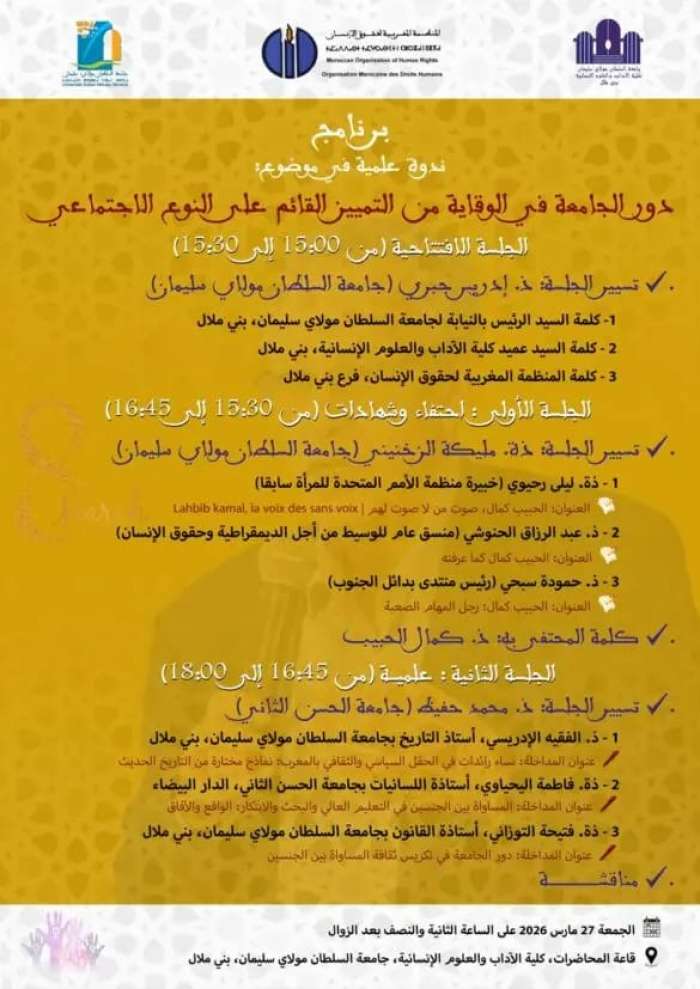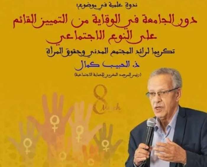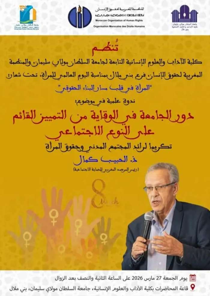 بمناسبة اليوم العالمي للمرأة ،ومن تنظيم كلية الآداب والعلوم الإنسانية جامعة السلطان مولاي سليمان ببني ملال ،والفرع المحلي للمنظمة المغربية لحقوق الإنسان ،تحتضن قاعة المحاضرات بذات الكلية ،وتحت شعار : "المرأة في قلب مسار البناء الحقوقي"،الندوة العلمية التي تحمل عنوان:"دور الجامعة في الوقاية من التمييز القائم على النوع الاجتماعي "وذلك تكريما لرائد المجتمع المدني ،رييس المرصد المغربي للحماية الإجتماعية ،الاستاذ كمال لحبيب ..