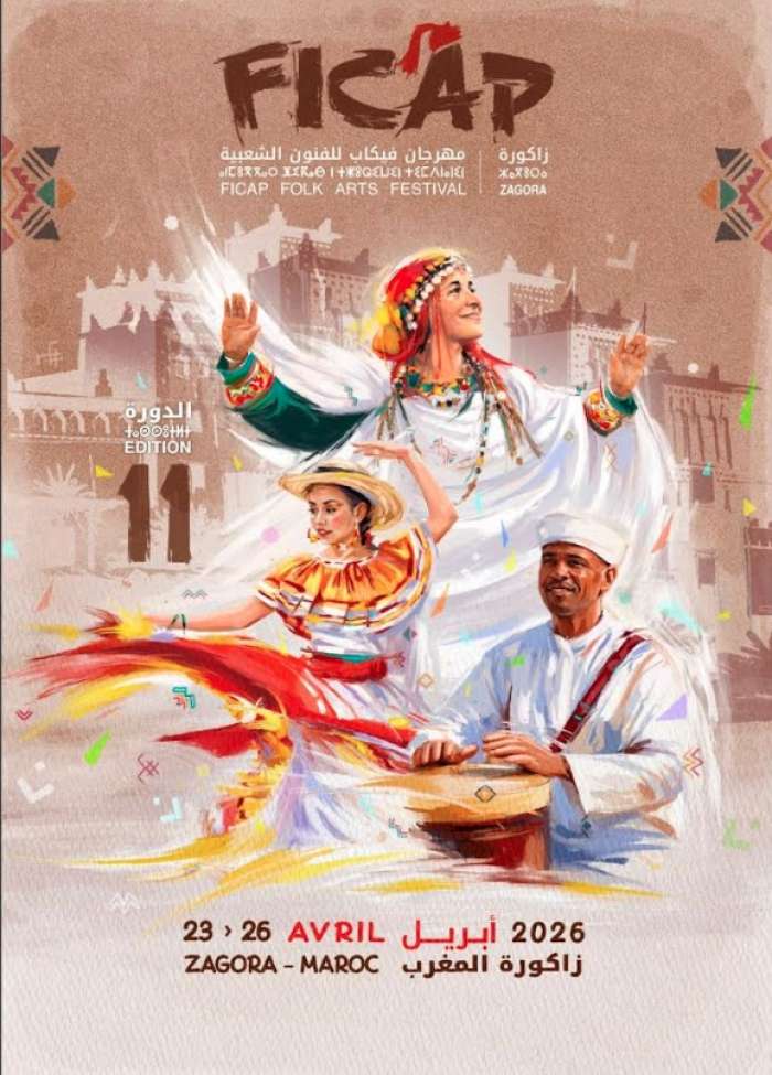 تنظم مؤسسة فيكاب بزاكورة، الدورة الحادية عشرة لمهرجان فيكاب زاكورة للفنون الشعبية، وذلك من 23 إلى 26 أبريل2026، بمدينة زاكورة، بشراكة مع عمالة زاكورة والمجلس الإقليمي لزاكورة ووزارة الشباب والثقافة والتواصل والمكتب الوطني المغربي للسياحة.